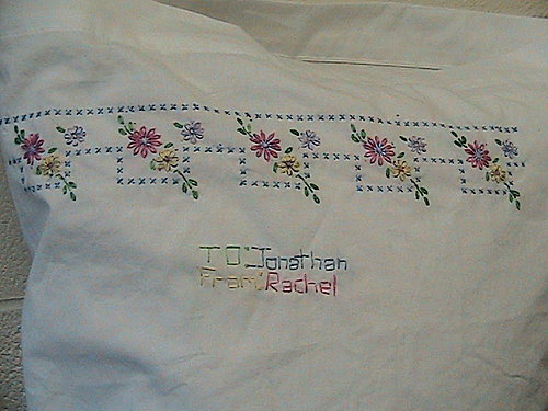 阿呆在車上,幫哥哥繡的枕頭套!