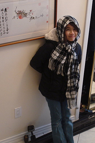 (天天罵哥哥姐姐胖,自己也會怕胖.其實,她是最瘦的那一個!)下校車後,要走3分鐘才會到家,她說:冷到後不了! 才將圍巾包在頭上