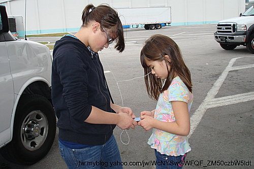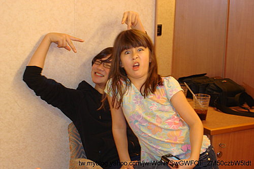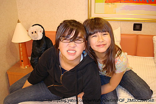 左等右等不見工作人員過來,兩個姐妹倒是"調節成功",不再打架,直接分享IPod上面的電影,看起電影來啦