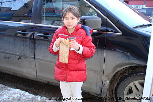 在大學區裡,等艾瑞的期間. 小的哇哇叫:太無聊! 所以,我們下車買杯熱巧克力和巧克力餅乾. 好冷!!大茶米就坐在車上,引擎開著, 玩DS遊戲!