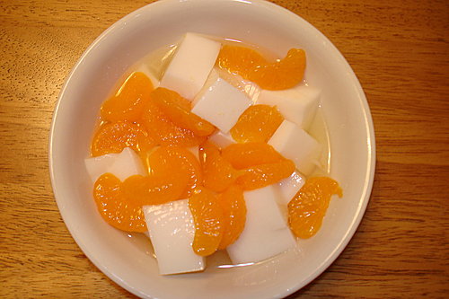 回到家,給自己弄了份甜點杏仁豆腐加罐頭的橘子! 好吃! 沒人敢吃,我自己可以吃兩天!
