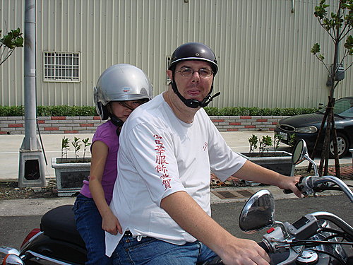 倪爸和艾琪,準備出發了!安全帽好像帶錯對象了呵呵呵!