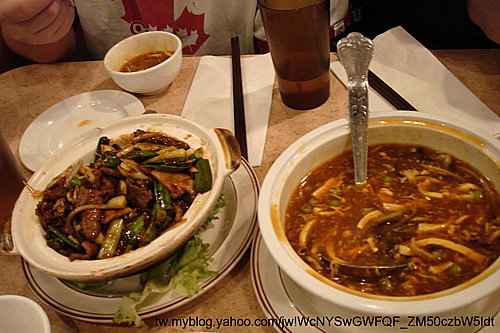 男生用點菜的, 就是蔥爆牛肉和咕咾肉及大茶米最愛的酸辣湯,外加白飯三份.