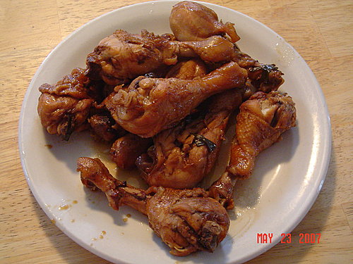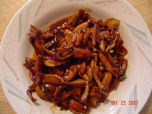 三杯田雞腿,我沒用米酒和糖.就用薑和麻油爆香,加上辣的蒜末,下去炒田雞腿,再用剩下的可樂及少許的醬油,加上九層塔